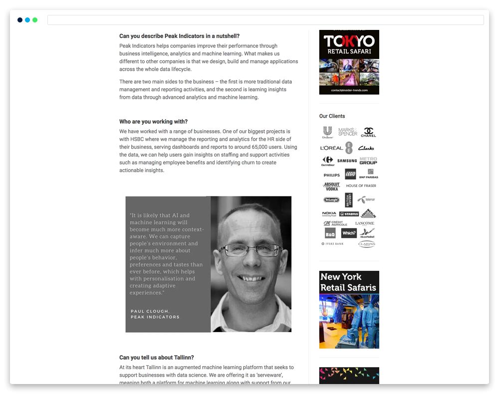 I recently secured this interview with Insider Trends for machine learning and business intelligence consultancy Peak Indicators. The initial pitch was strengthened by emphasising the credentials and expertise of their Data Science Lead Paul Clough, as well as the company.