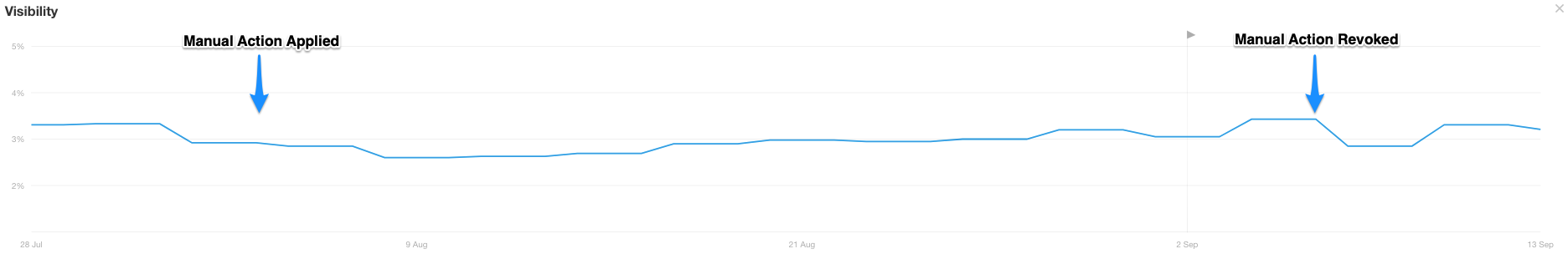Reviewing the month in between receiving the manual action and getting it revoked, it turned out that Google had been fairly soft on our client’s site and we saw very little impact on their traffic volumes and SERP visibility.