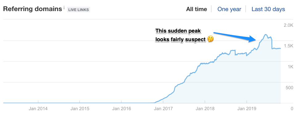 Instead, we combined their report with the Ahrefs Referring Domains report which enabled us to choose backlinks which were ‘First Seen’ at any point during 2019. Using Ahrefs also immediately identified a probable time period that the unnatural links were acquired during.