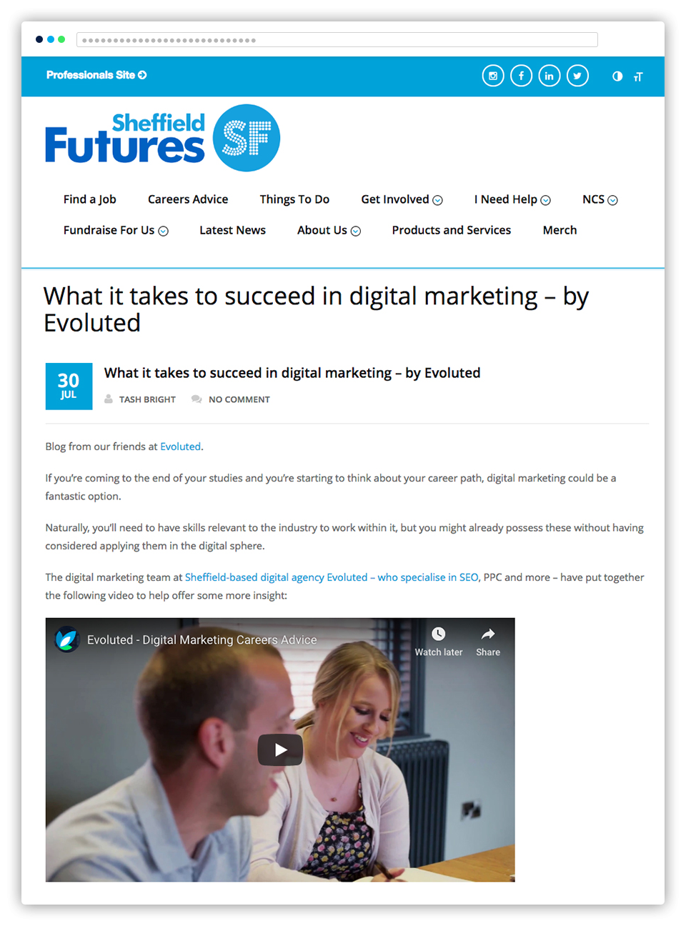 We put this article together for Sheffield Futures, as a means to help their audience understand some of the useful things they can do to get into a career in marketing. It was important to position the content so that it worked for the readership.