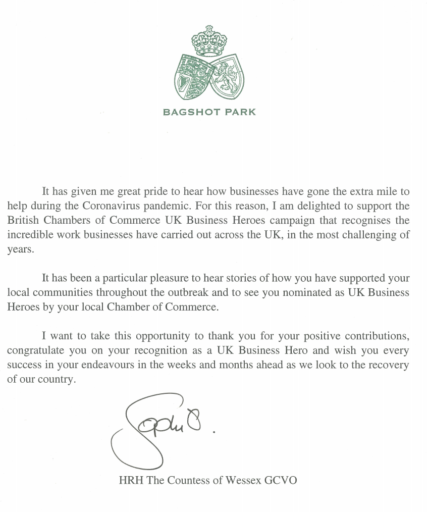 We’re delighted to receive confirmation of our status along with a letter from HRH Countess of Wessex thanking us for our positive contribution.