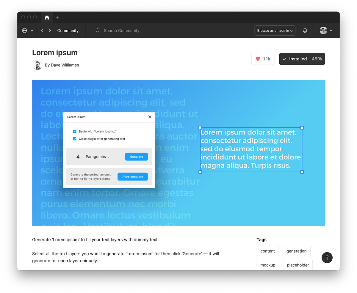 The Lorem Ipsum plugin can automatically fill the selected layers with the perfect amount of ‘Lorem ipsum’ to fill your text layers.