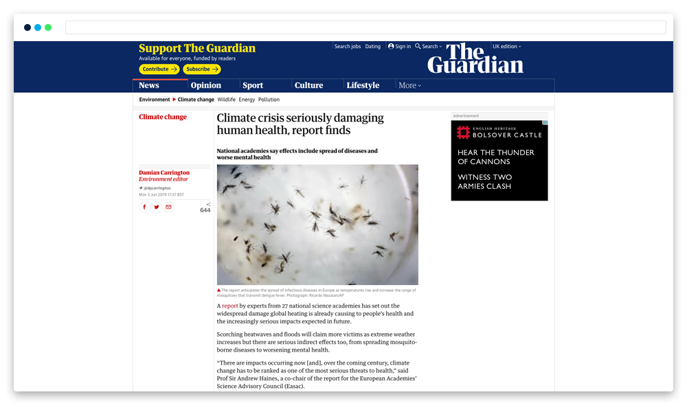 This story in The Guardian does a great job of impressing how vital it is that there is a change towards mankind's approach to climate change. If you had a relevant client, you could offer a story that shows an example of how the problem is being tackled.