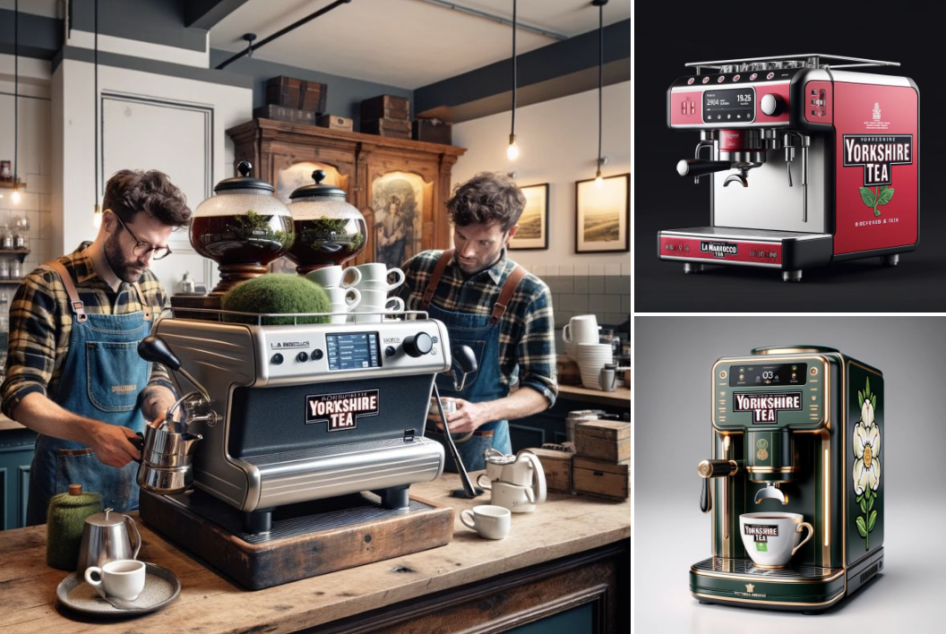 Imagine a cozy, modern coffee shop interior with sleek tiled walls and wooden floors. In the center, there’s a shiny coffee machine, but with a twist—it’s been custom-branded with the Yorkshire Tea colours and adapted to serve tea - sorry La Marzocco UK and Victoria Arduino! Will die hard coffee drinkers hate it? Probably. Does a branded Bettys & Taylors of Harrogate Yorkshire Tea coff-tea machine look banging? Yes, it does.