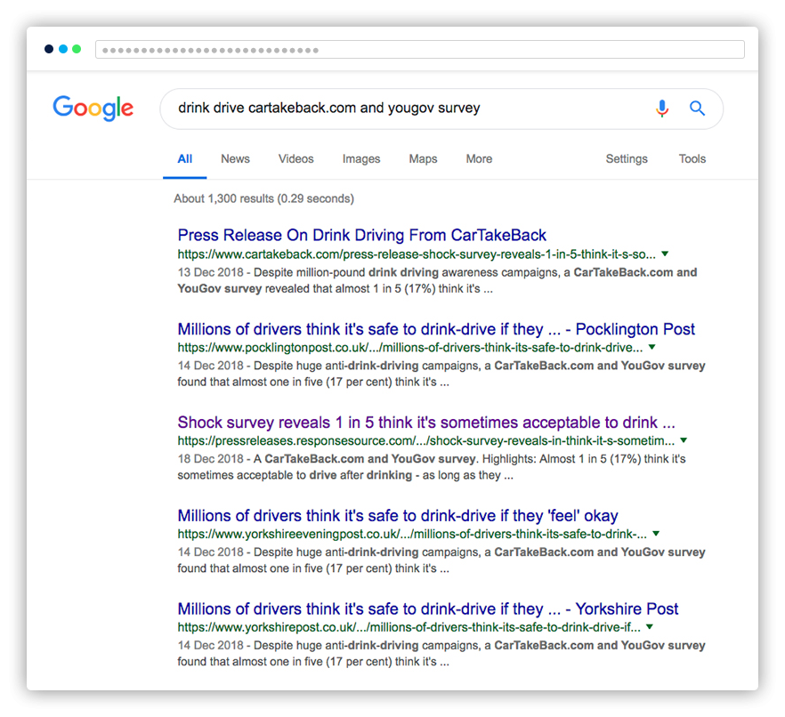This screencap shows a snapshot of some of the coverage we received for a study commissioned on behalf of one of our clients, CarTakeBack. This was an example of an idea that generated large-scale interest from a variety of UK publications.
