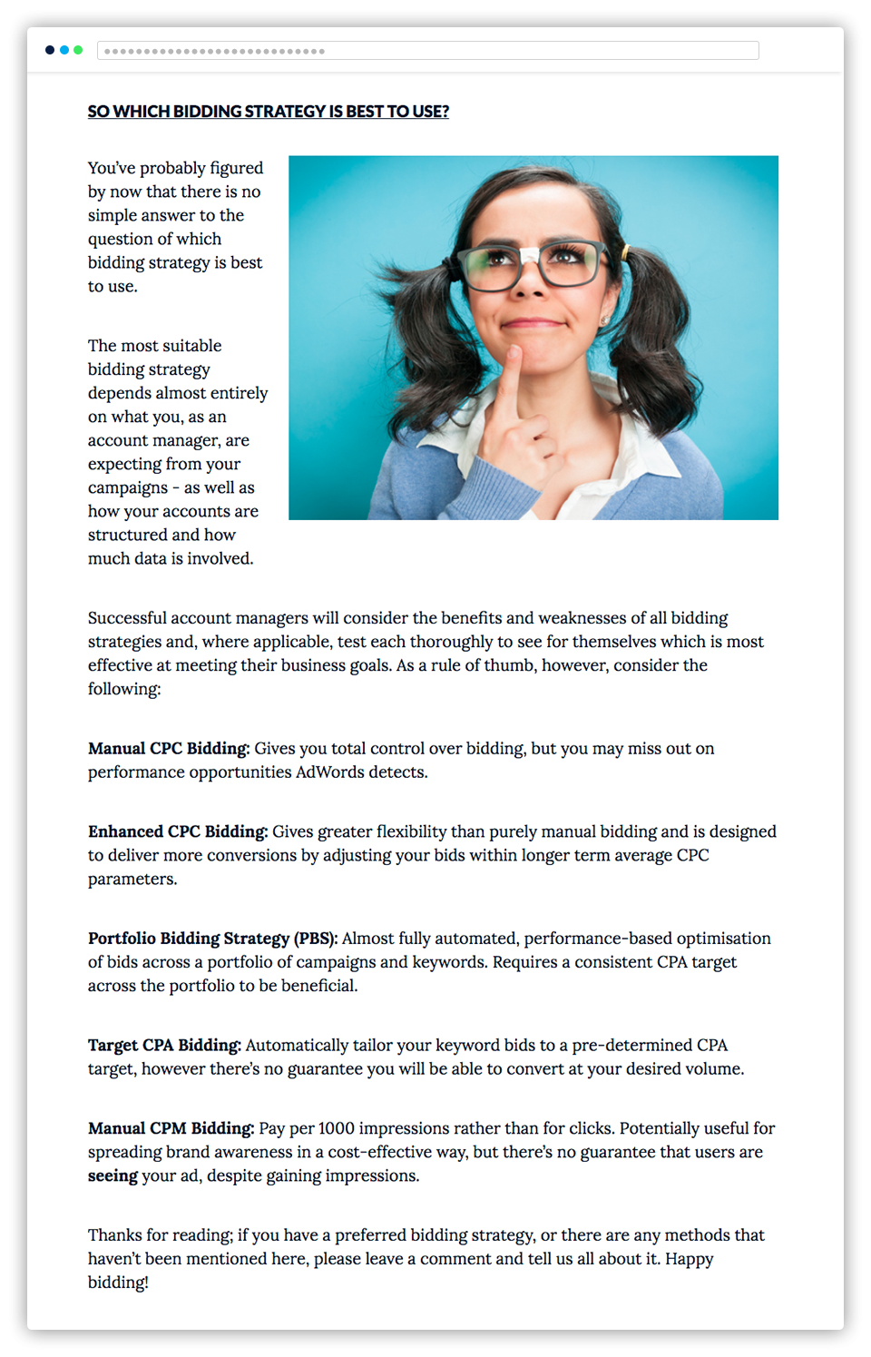 Here we see an example of a strong conclusion within a piece of marketing content on the Evoluted site surrounding Google Ads. The writer summarises the points made throughout the article and offers the key benefits of using each of the bidding strategies.