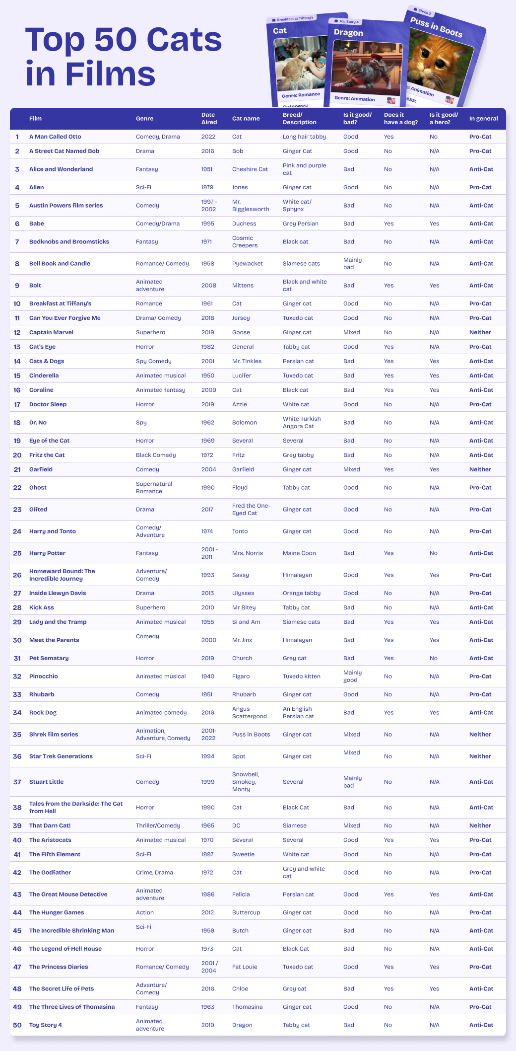 By conducting thorough research, the PR team at Evoluted meticulously examined how cats are portrayed in the media. We delved into popular films using sources like IMDB, Wikipedia, and Cats in Cinema, identifying the 100 most prominent feline characters. From this list, the top 50 cats were screened to analyse primary themes and detect any anti-cat sentiment.