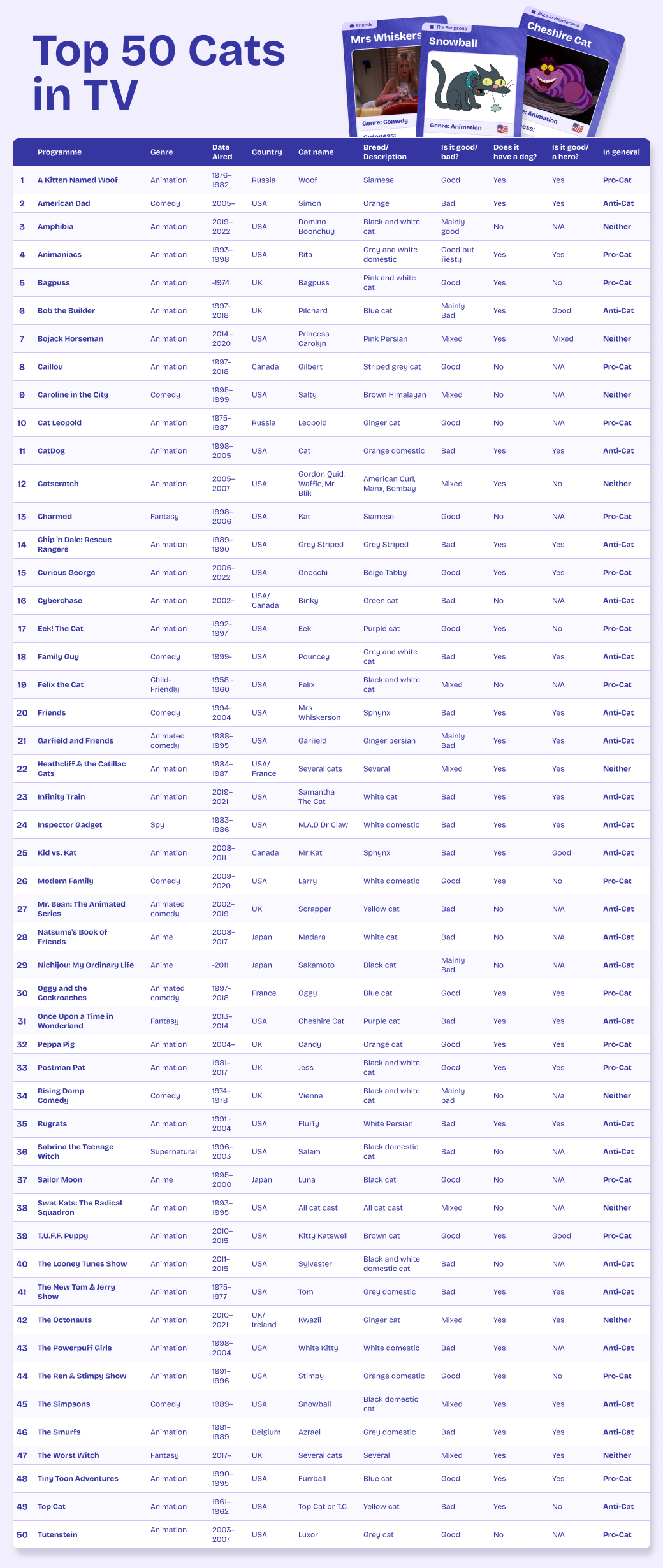 By examining IMDB's top 100 feline characters in popular TV shows, we selected the top 50 that played the most pivotal roles in the episodes, subjecting them to detailed analysis. Through conducting extensive research, the PR team at Evoluted scrutinised how cats are depicted in the media, to reveal recurring patterns and general anti-cat biases.