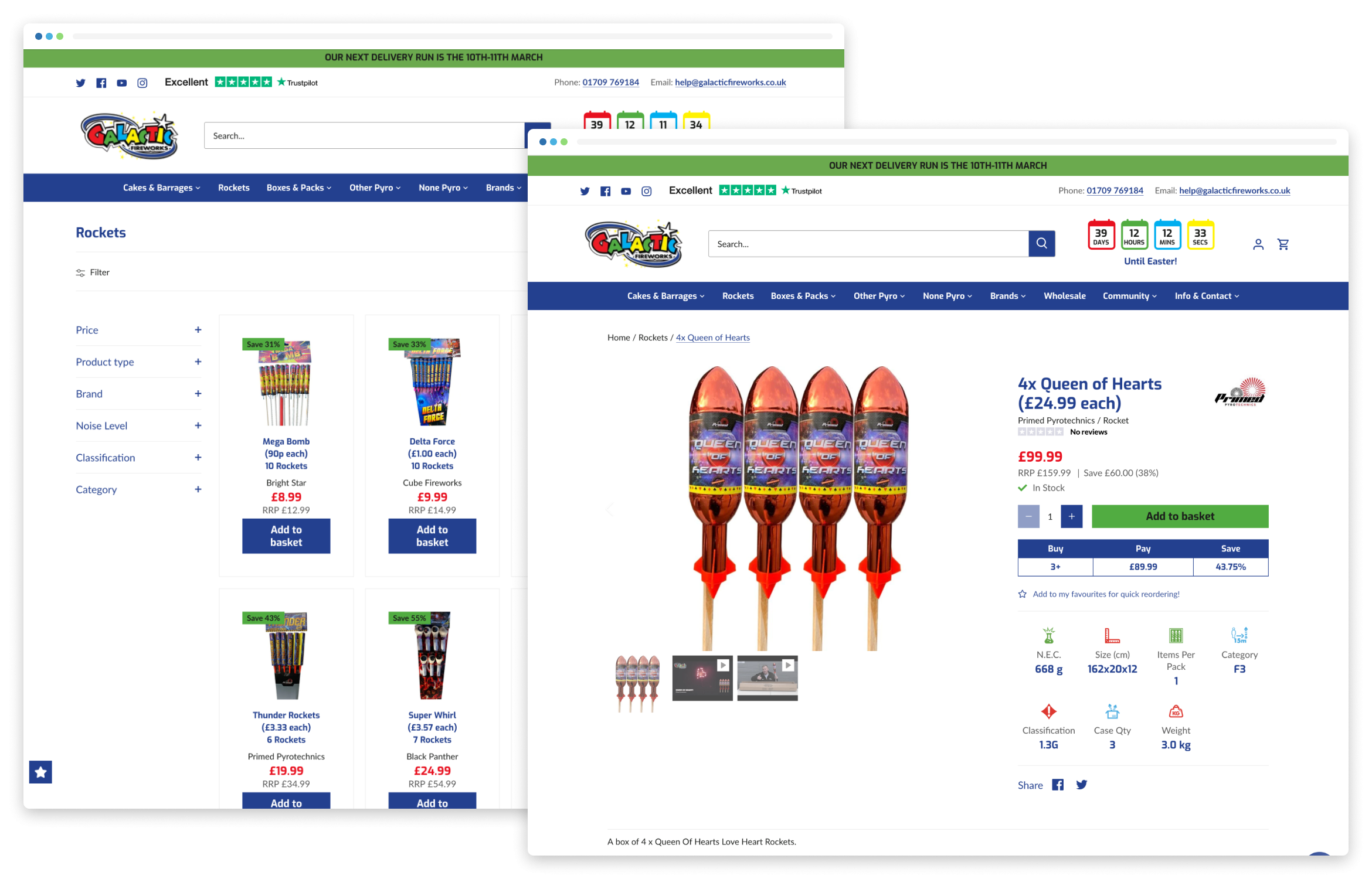 When Galactic Fireworks approached us to help them with this project, they were just months away from their sale weekend so time was an issue. Development started in April and the site launched in June, leaving Galactic Fireworks time to familiarise themselves with the new site before their peak period.