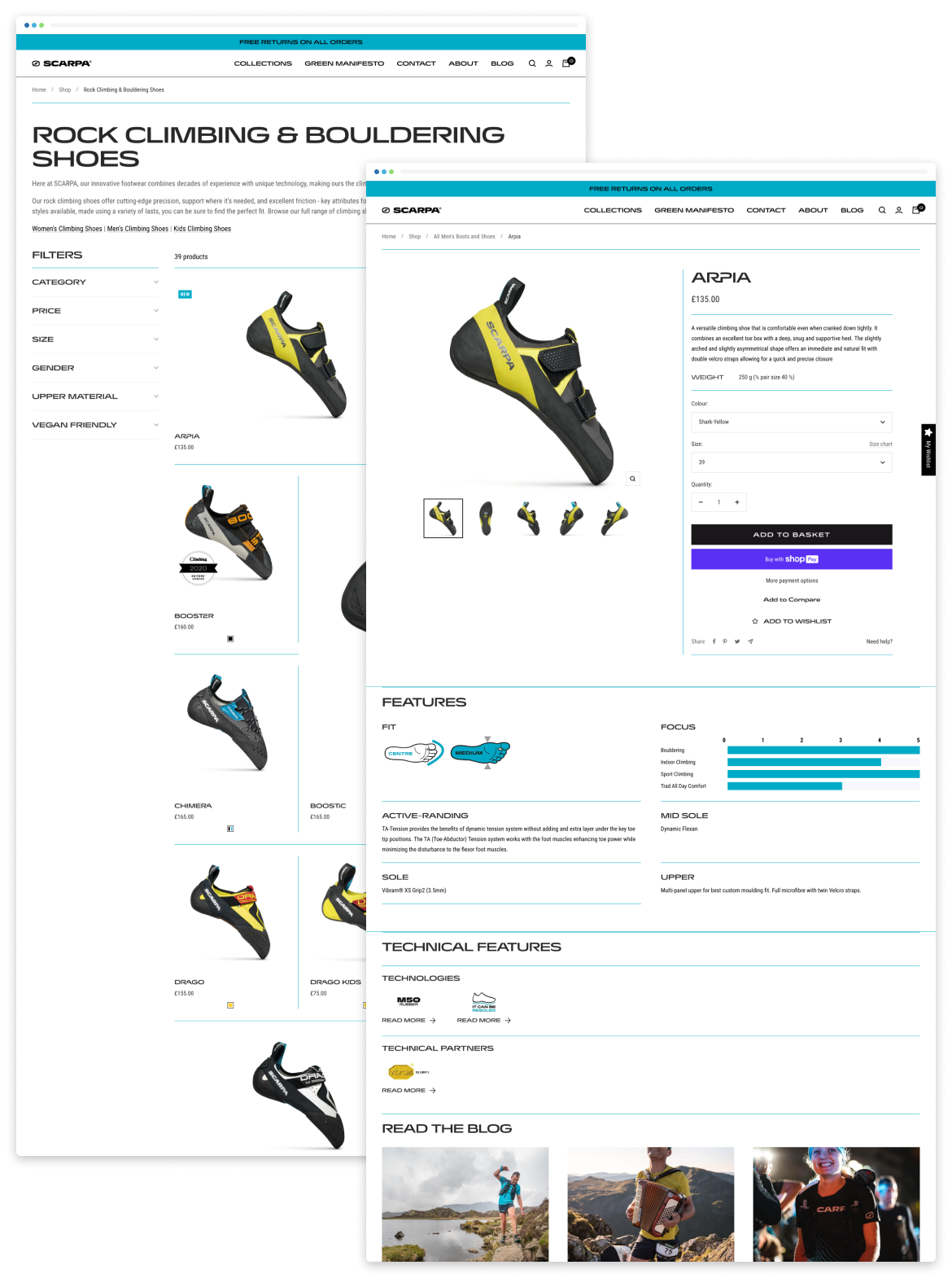 The Evoluted marketing team completed a comprehensive audit and identified performance issues on SCARPA's previous website. The site’s basket area - arguably one of the most important sections of an ecommerce site - was a particular problem, placing them at a significant disadvantage to their competitors. To address these challenges and bridge the gap, Evoluted and SCARPA chose to migrate to Shopify, helping them to not only match the competition but be even better!