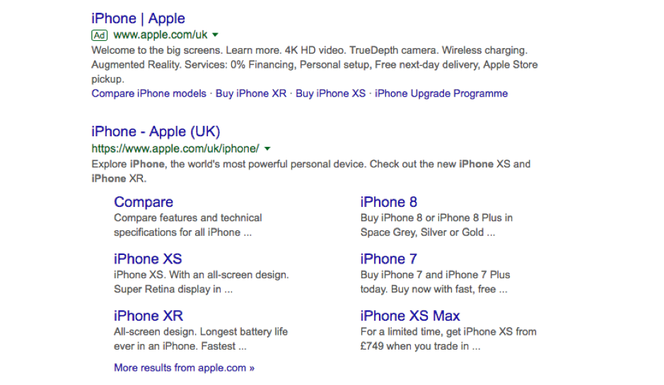 If we look at Apple as another example, you can see that they have reinforced their dominance of the first page, by appearing at the top of the page for both organic and paid listings.