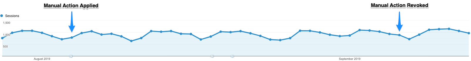 Reviewing the month in between receiving the manual action and getting it revoked, it turned out that Google had been fairly soft on our client’s site and we saw very little impact on their traffic volumes and SERP visibility.