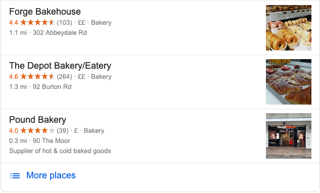 Let’s conduct a search for ‘gluten-free bakeries in sheffield’, it’s a clear local search so we get the triple map-pack right at the top of the SERP.