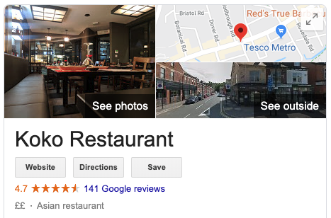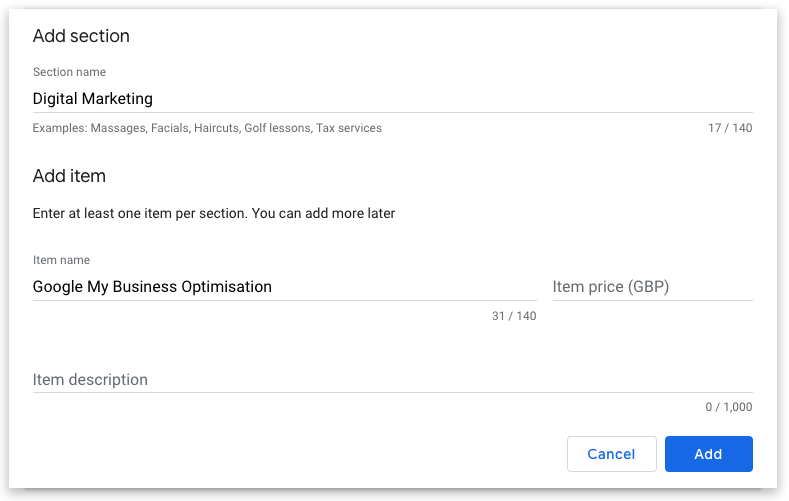Extra Tip: If you are a food and drink business and have a literal menu, Services will be replaced with a Menu option instead. Unfortunately you’ll have to add all your menu items by hand as there’s no option to ‘upload’ a menu yet. However if you’re website is laid out clearly, Google may automatically pick up your menu URL and link directly to this from your GMB profile instead.