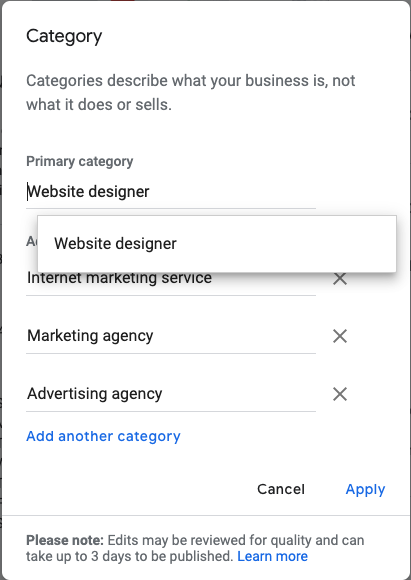 Helpfully, Google My Business also allows you to select multiple categories to help describe what your business does. Choose as many that make sense without overdoing it and sending mixed messages about your business.
