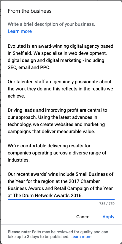 However, Google My Business allows you to add up to 750 characters to the Description field and we recommend making use of as many of those characters as you can.